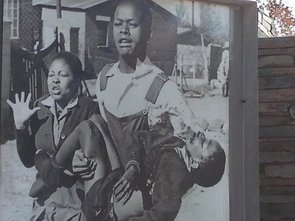 "Du siehst auf dem Bild Mbuisa, der in seinen Armen einen Jungen trägt, Hector Petersen...das war 1976 – der Aufstand in Soweto – als die Studenten und Schulkinder sich versammelten und das Ende der Apartheit forderten...Hector wurde erschossen, aber nicht nur er. An diesem Tag wurden über 600 Schulkinder getötet...Ich lass da nicht mehr alles an mich ran – die Erinnerung öffnet dann wieder alte Wunden..."
